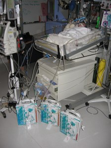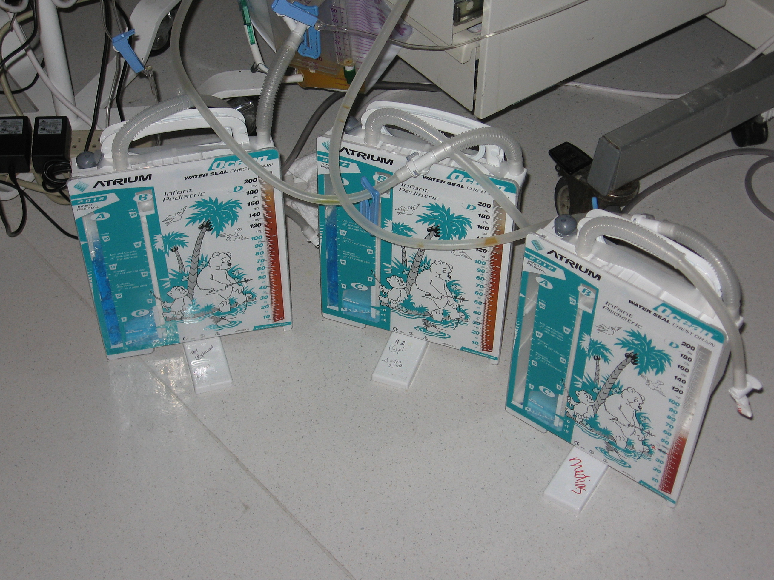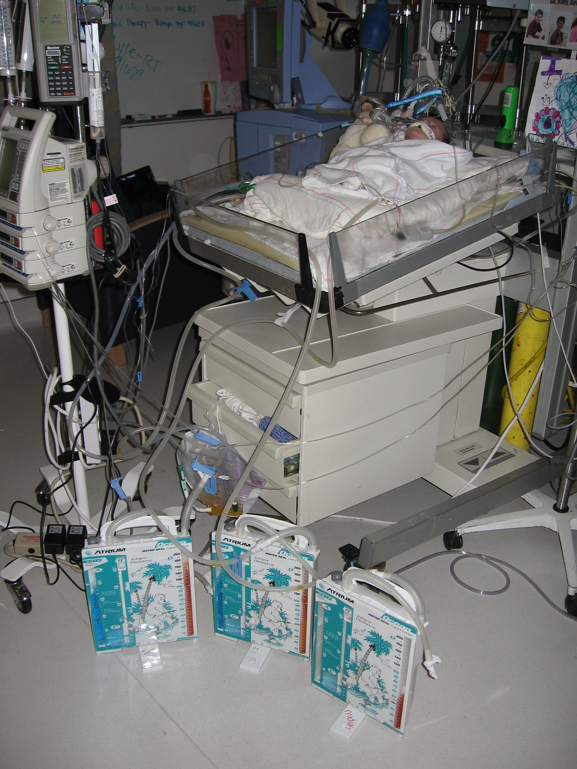Well, our fascination with the generic bear chest drain is coming back to haunt us as Rudy now has THREE guarding the foot of his bed!!!  The procedure they did earlier today to drain the fluid around his heart is called Pericardesis.  The procedure was successful and quite a bit of fluid has drained already and his heart rate and blood pressure have stabilized.  Nurse Faye sent the fluid to be tested right away but this particular test could take up to 24 hours so it is unlikely we’ll hear back today on the results.  From what I understand, depending on what kind of fluid is draining from the sack around the heart, Rudy could be treated simply with medication and continued drainage from the generic bears for the next 24 hours or so…OR it could require another surgery (a.k.a. opening him up again) to ligate a duct in the chest where the leak is occurring.  So, we must wait and see.  Obviously, this delays moving forward on getting Rudy off the ventilator.  They tried a sprint early this morning and he was back to tolerating it for only 30 minutes but Dr. Reemtsen wasn’t too concerned feeling like it was most likely because this darn fluid was putting pressure on the heart.  I think he feels Rudy will get back on track once the fluid issue is resolved.  Rudy looks alot stronger going into this weekend than he did when things started to go wacko last Friday so I’m hopeful we won’t have a repeat of last weekend’s episodes!  We sure would appreciate your prayers for such.  I’ll keep you posted…