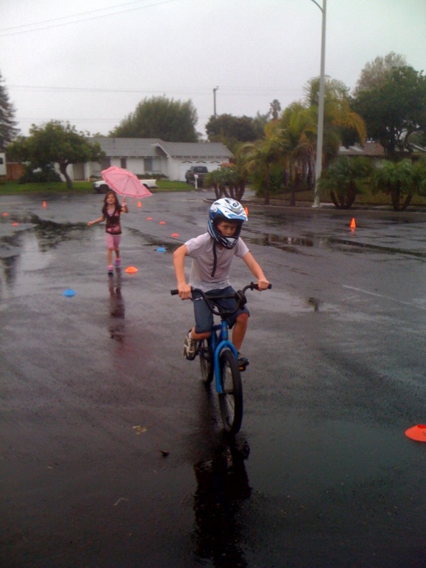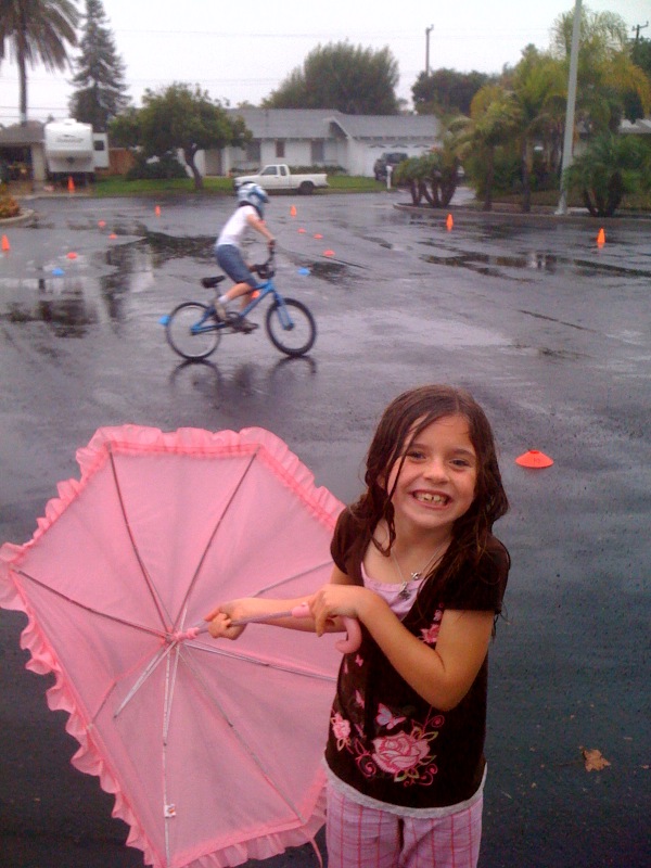 3. You guys are every kids dream parents: jumping off the roof into the pool and now playing and riding bikes in the rain! Do kids fight to have you ‘baby-sit” them? Press on.