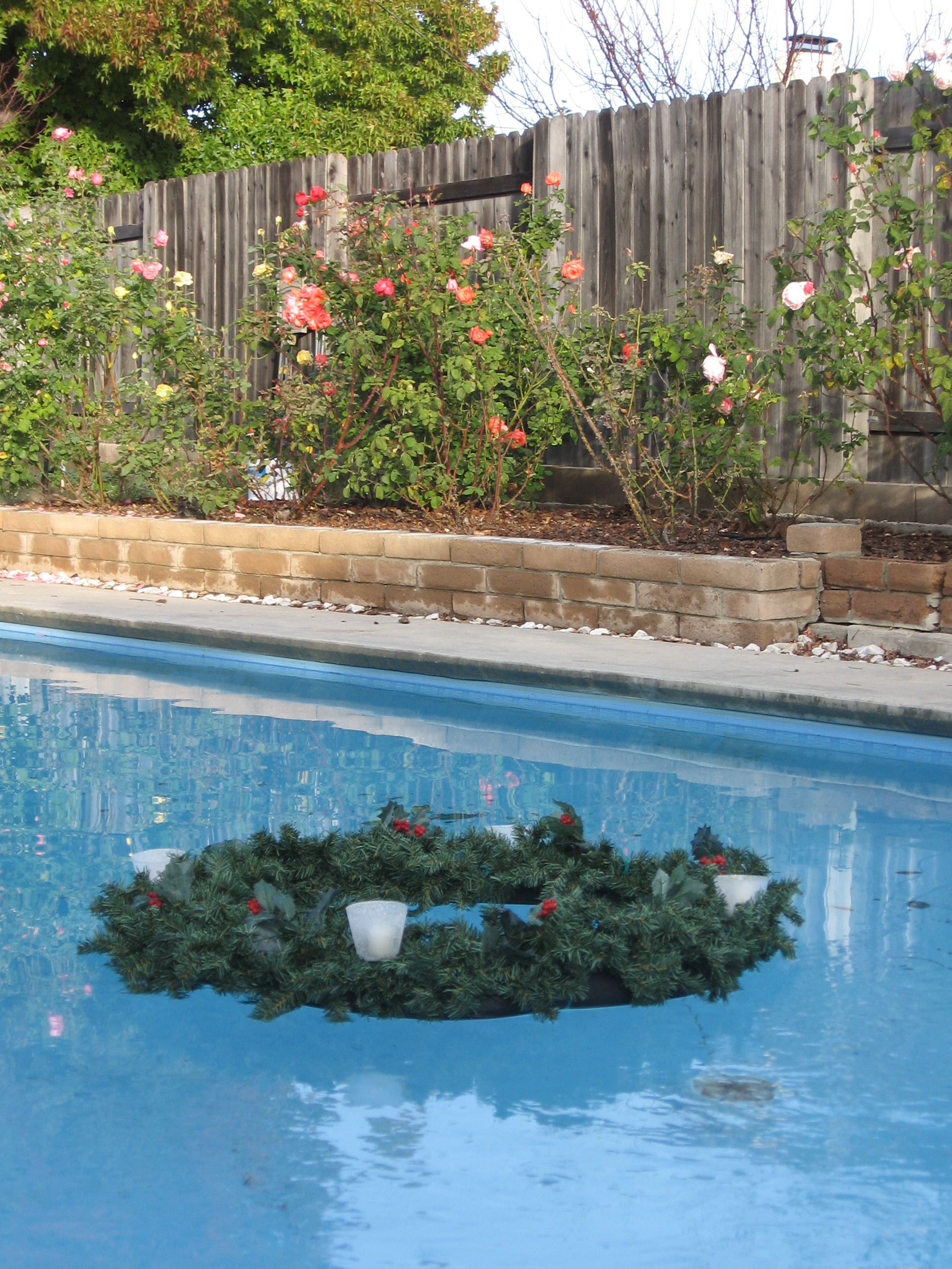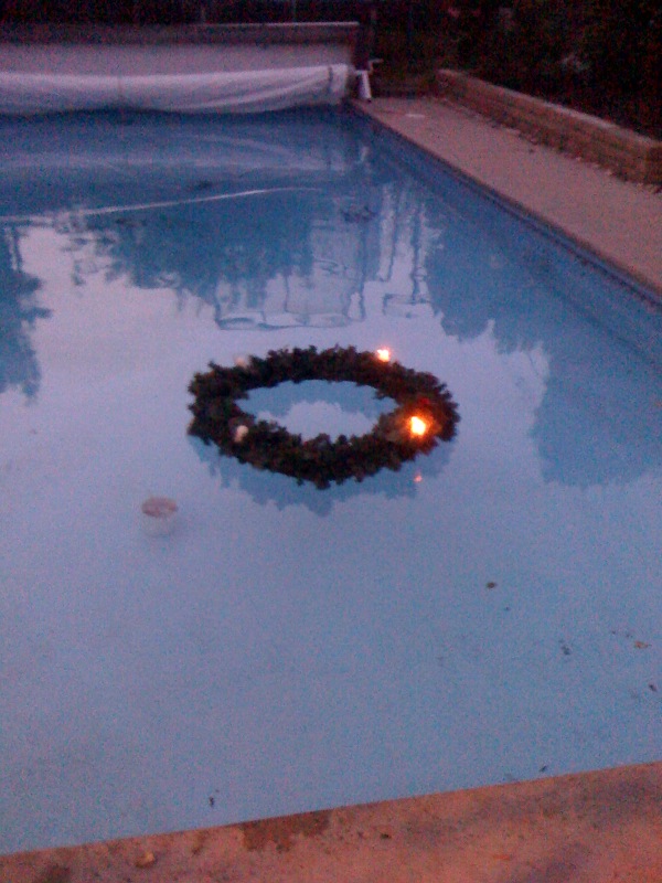 It took some tweaking to get things working right.  I anticipated accumulation of rain water so I drilled holes in the candleholders to let it drain (but this didn’t prevent the wicks from getting saturated).  A larger struggle with buoyancy temporarily made it the first sub-aquatic holiday decoration, but switching from an inner-tube (prone to leaks) to foam rectified that situation.  My camera skills aren’t good enough to capture it’s full nightime splendor, but I still think it conveys what your celebration will be lacking without a PuleTide (TM) advent wreath.