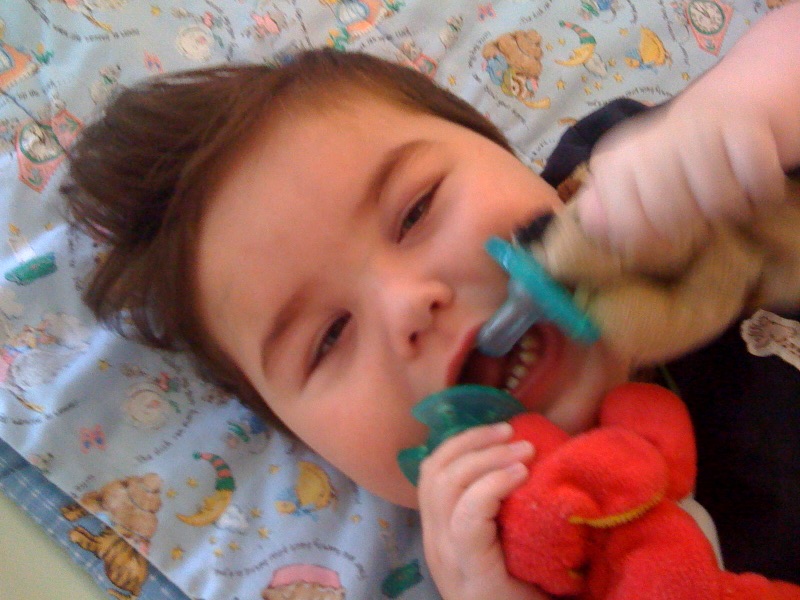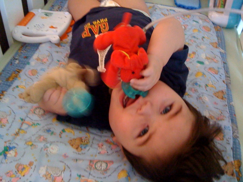 We’re enjoying a fun visit with Rolf’s parents.  Rudy is pretty pleased to have Oma and Opa’s undivided attention during the day while the big kids are at school and Rolf is at work.  🙂  Rudy is also very pleased with Oma’s stellar sewing skills as his defective pacifiers are now repaired.  You may recall from past posts that Rudy’s favorite toy is the Wubba-Nub pacifier (introduced to him by cousin Becky when he first came home from the hospital)…a cute, small-enough-to-hold stuffed animal with a pacifier sewn to it’s mouth.  Rudy has about 6 of these little treasures now and in the past several weeks, he has managed to bite right through the nipple of the pacifier forcing me to cut the nipple off so he doesn’t choke on the little pieces he bites off.  Well, clearly he is getting too old for the pacifier and yet developmentally he could still use the “self-soothing” benefits of the darn thing.  So, we were getting pretty desperate as we were down to our last pacifier.  Then yesterday Oma did her magic and managed to take off the old, nipple-less paci and sew on a NEW one…just like that…no special sewing machine…just a needle and regular thread through thick rubber!  Well, at any rate, Rudy is back in paci-heaven with all of his Wubba-Nubs repaired with pacifiers we brought home from the hospital.  Happy 23 Months Little Man!!!  Enjoy those pacifiers while you can…it won’t be long before they go “Bye-Bye” like Wilson and Maxi’s did about 12 and 10 years ago!
