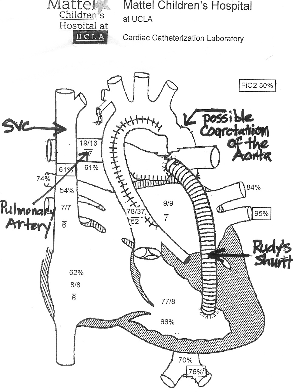 Because Rudy doesn’t have the left side of his heart, he is currently known as a mixed-blood baby.  His oxygenated and non-oxygenated blood flows through the shunt that was attached in his first surgery (Norwood) – see diagram above.  The Glenn procedure will begin the process of separating his blood.  In the diagram above, you’ll see that the SVC that is bringing the blood from the body back to the heart is located in front of the pulmonary artery at a 90 degree angle.  In the Glenn, the SVC is severed from the heart and attached directly to the pulmonary artery.  Essentially, we’ll be relying on the blood from the upper body to “drain” it’s way directly to the lungs instead of being “pumped” to the lungs through the heart.  The success of this procedure is dependent on good lung health as well as little blood resistence so the blood is allowed to drain into the lungs.  (Rudy has been treated with two Pulmonary Hypertension drugs for the past 6 months to reduce this resistance)