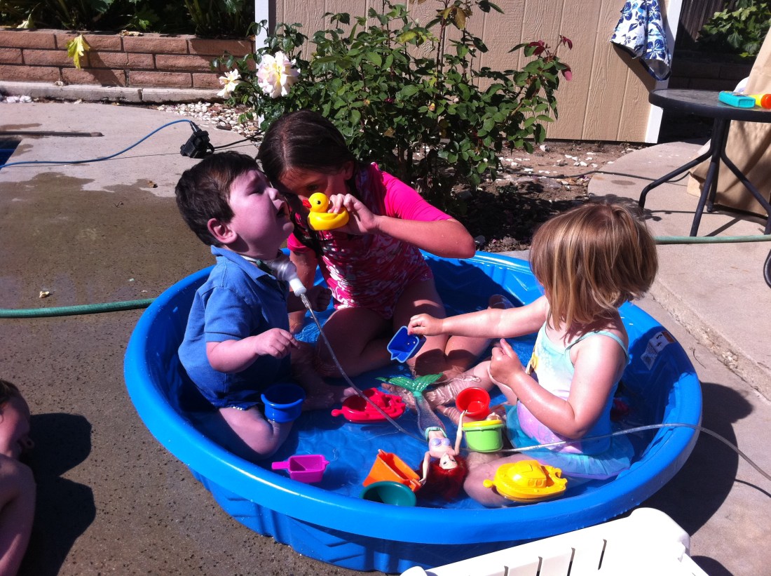 Although the kids have been swimming the past couple of weekends, this weekend felt more like the official start to the summer season with the family pretty much camped outside on the back patio all day Saturday and Sunday. The kids logged hours in the water, a couple of roof jumps and some “modified” water-fun with Rudy (see pics below). I consider it a huge victory that none of the fair-skinned Geylings got sunburned! Aside from Rolf’s raging allergies and my post-royal wedding blues, it was a perfect weekend. Happy May Day Everybody! And Happy 31 months Rudy!