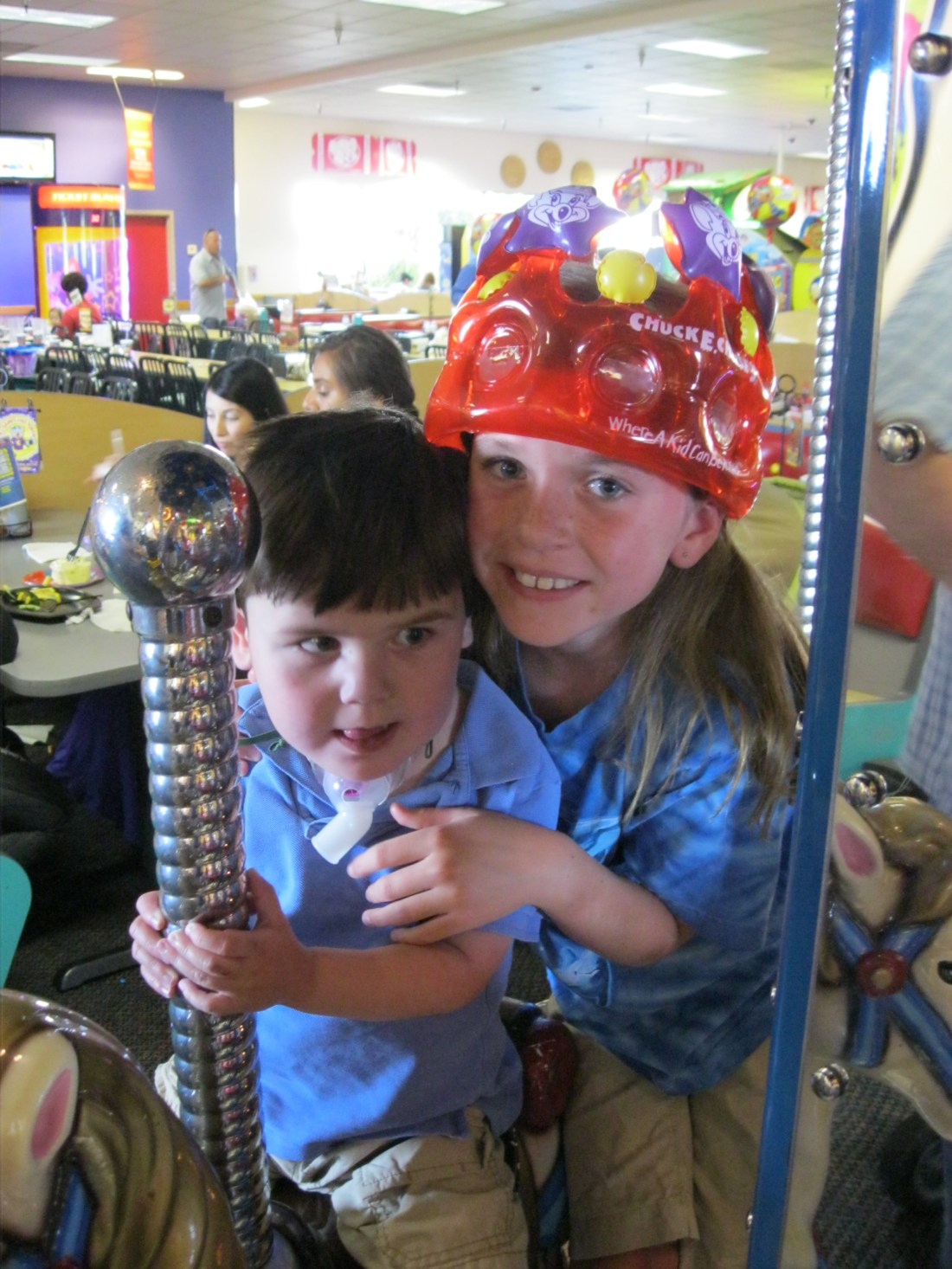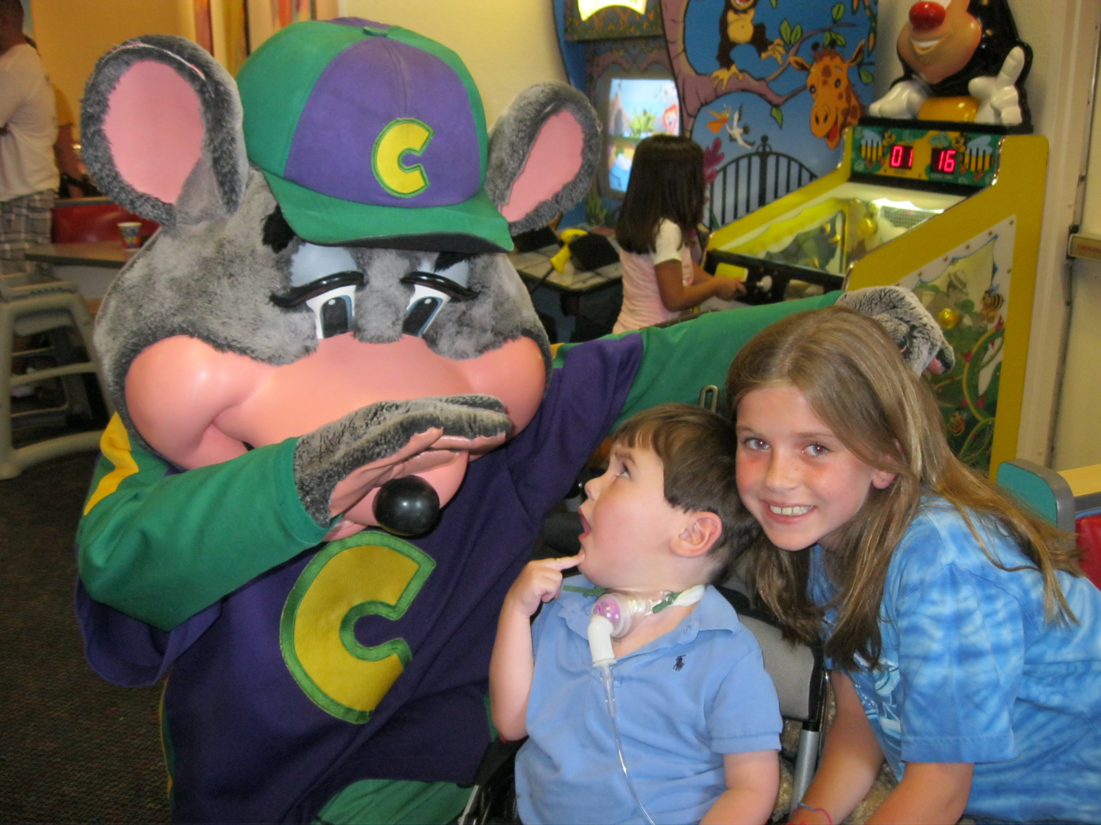 Our big girl turns  9 years old tomorrow…a special birthday as Olivia will be 9 on 9-09.  🙂  We enjoyed a celebration with a few friends at Chuck E. Cheese’s on Sunday…a special treat for a special birthday.   Rudy and the big boys joined in the celebration too.  We were, of course, concerned that Rudy would not tolerate the noise and crowds at Chuck E. Cheese’s on a Sunday afternoon but we really wanted him to be a part of celebrating Olivia so we decided to give it a try.  Rudy was definitely cautious most of the time and not too sure about Chuck E. Cheese when he met him up close and personal  but he held it together (except for one meltdown during the high-octane stage show) and his presence helped to make Olivia’s celebration so special.