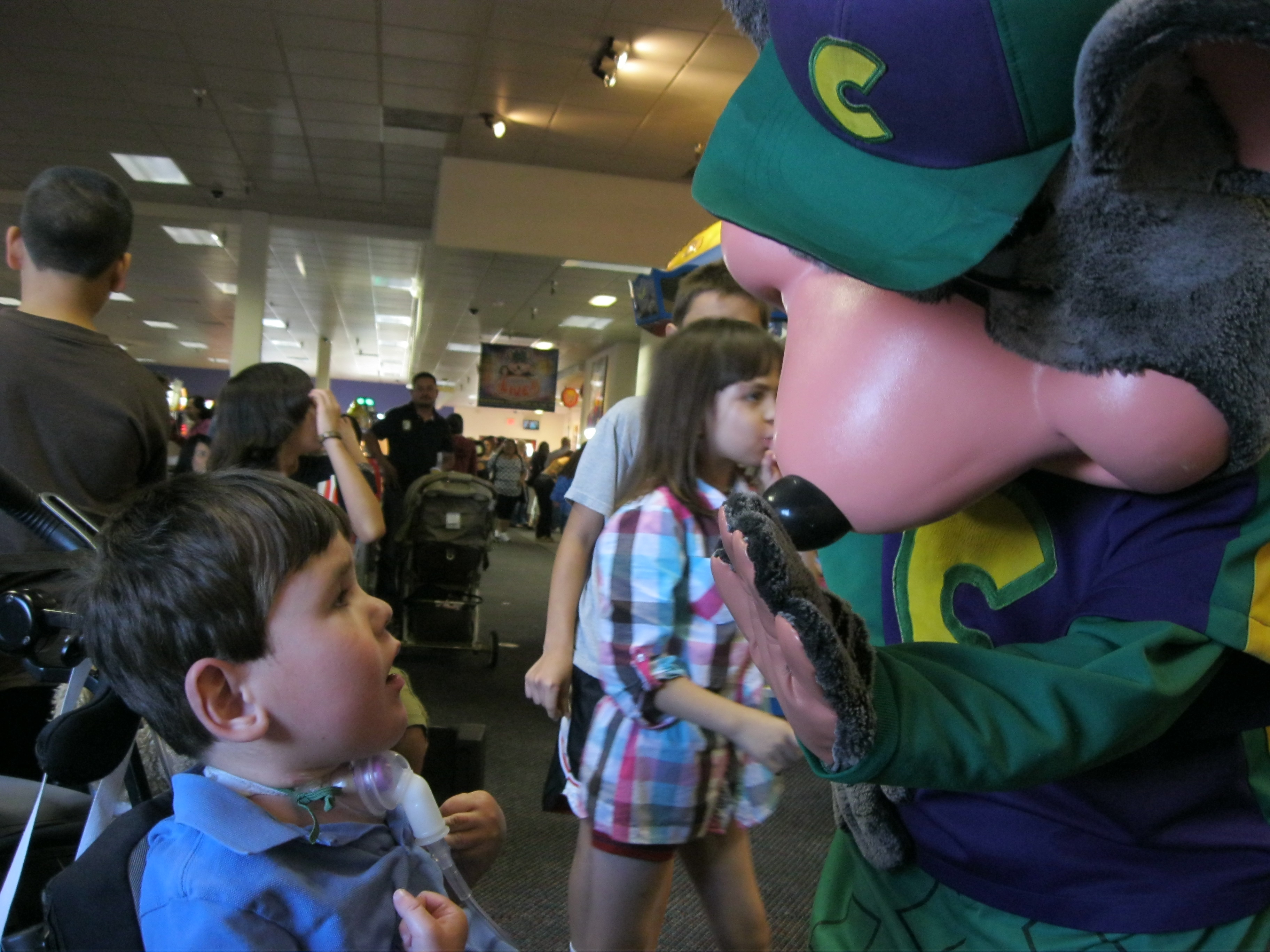 A guarded Rudy meets Chuck E. Cheese for the first time...