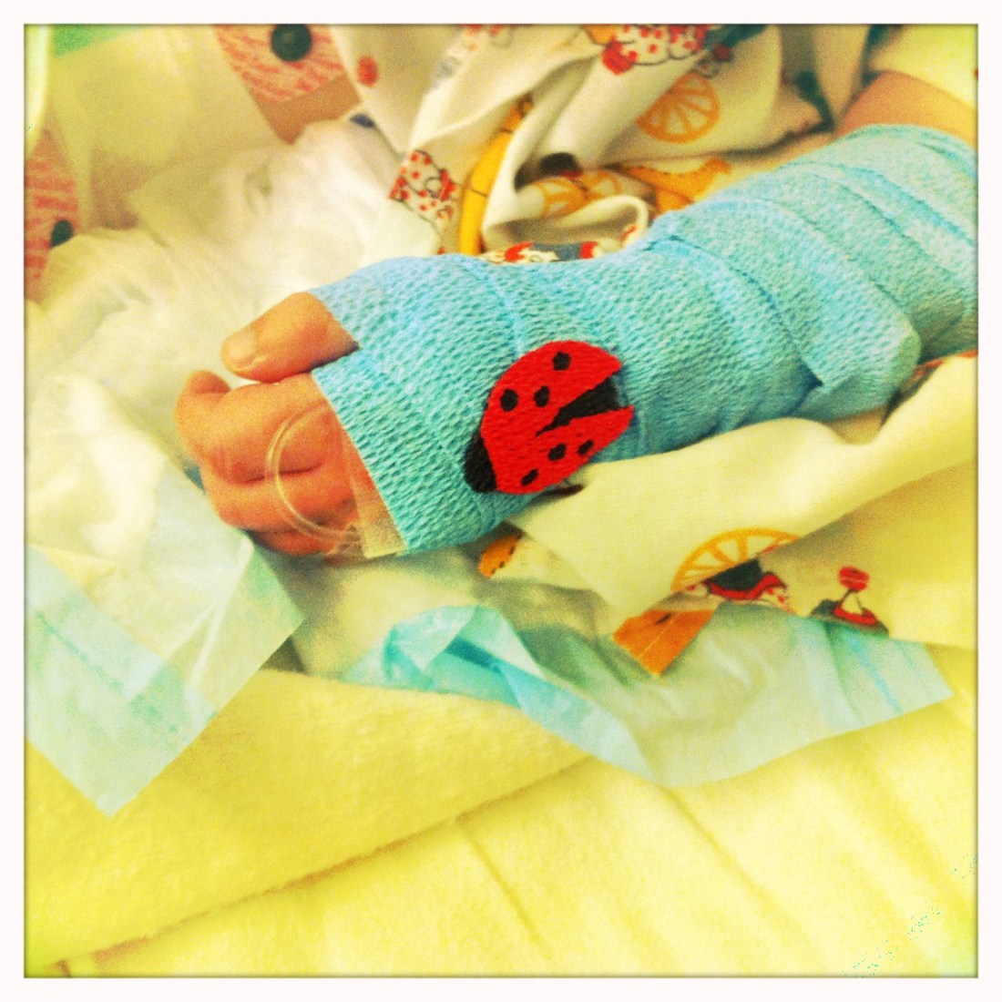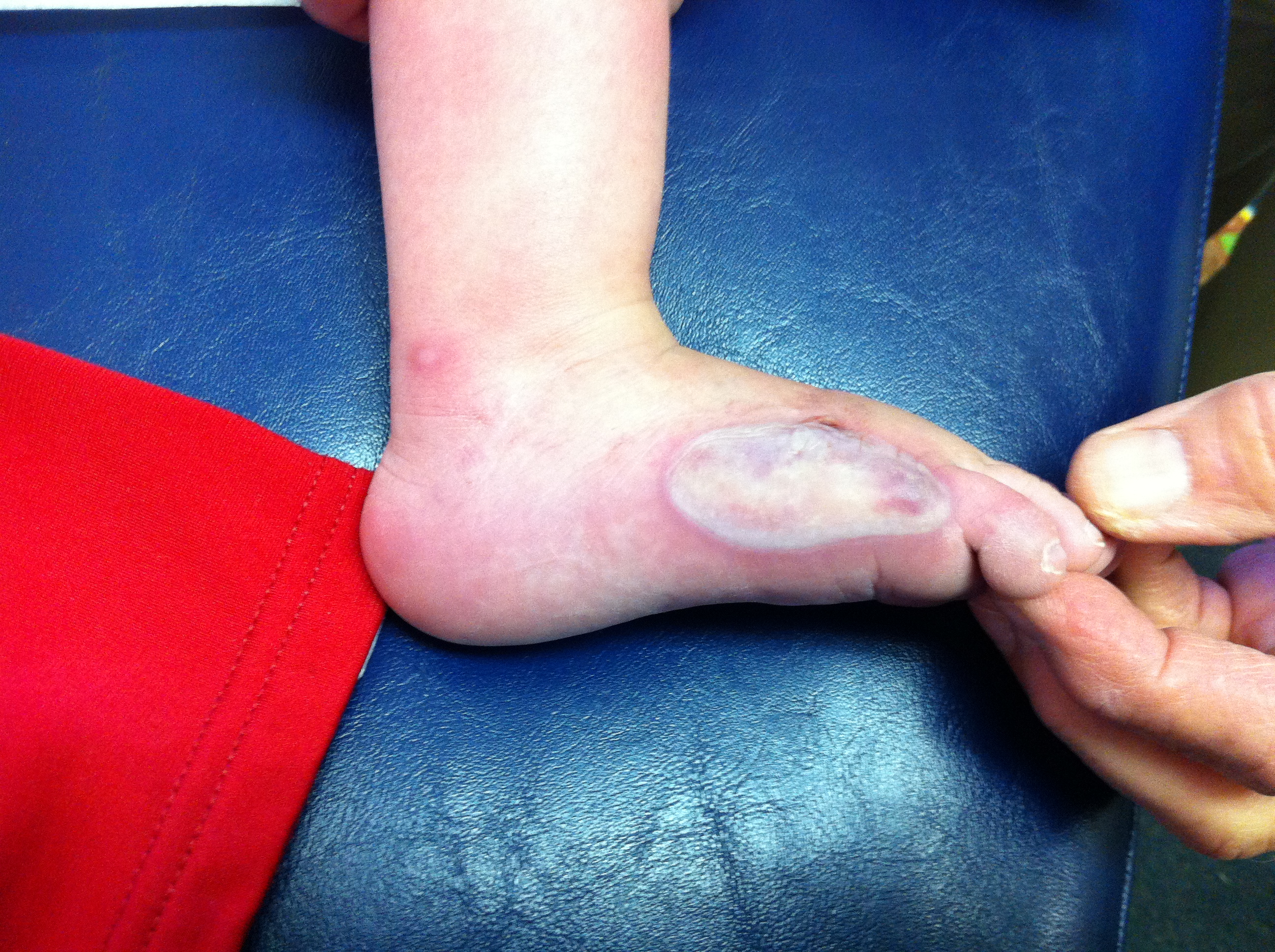 Thanks for all the funny and helpful comments about Rudy’s foot…we watched Toe-cephus carefully all weekend and got Rudy in to see the pediatrician yesterday. As we suspected, it appeared to Dr. Abbott Sr. to be a pressure wound from the IV wrap. He didn’t suspect it was infected but took a culture sample just to make sure. It looks ugly but it’s on the mend.