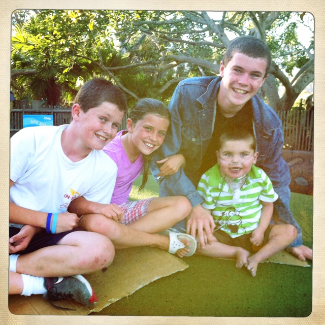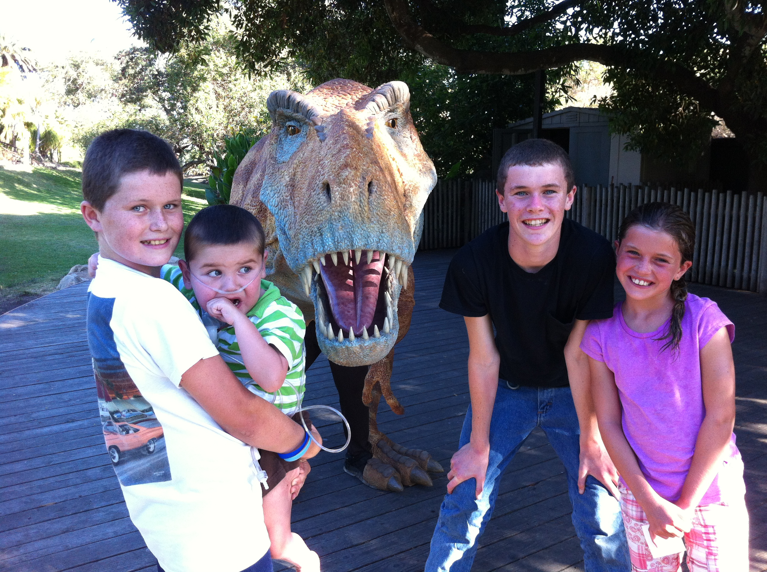 Wilson saw a SB Zoo event advertised on the morning news yesterday for kids with special needs and their families so we decided to be spontaneous and take advantage of this neat opportunity to roam the zoo after hours. The zoo was open from 5-8pm for special needs kids and their families to participate in a variety of “meet ‘n greets” with different animals and zoo keepers. It was very sweet and especially enjoyable for Rudy…no crowds, easy access to the animal displays in his wheelchair and the unique opportunity to see a snake, raven and armadillo up close! The best part, though, was playing with the big sibs…