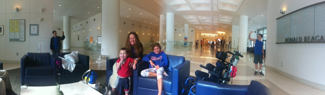 Got to UCLA by 7am as was requested for check-in. We’re case #3 so we got the paperwork done and asked them to call us so we didn’t need to keep Rudy in Pre-Op for the next few hours. Rediscovering the ways to occupy ourselves in the hospital. Already did some elevator dancing and now it’s cards. Trying to decide what’s next–Elevator Bingo or pretending the big dark tiles on the floor are alligator pits (first one all the way to the end of the hallway without falling in wins!)