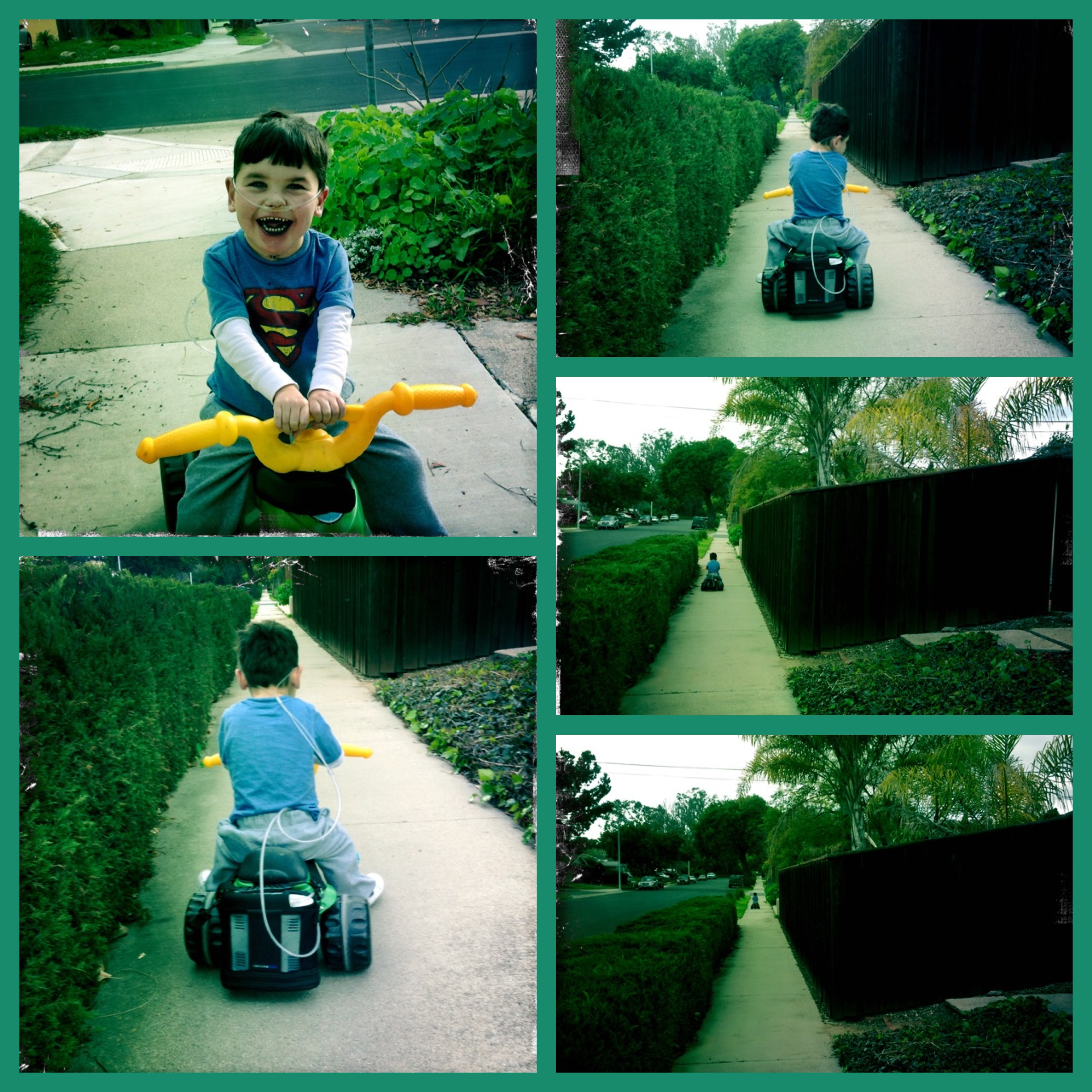 Rudy’s been battling a lot of congestion this week. As he seemed chipper, I rigged the Inogen to his bike and let him get some fresh air. Once he saw daylight, he took advantage of having no strings attached and went off to explore the neighborhood. Despite how much he huffed and puffed, every time I tried to point him home he gave me an emphatic “NO, DADDY!” and headed in the opposite direction. After 90 minutes, he exerted himself to a bloody nose and and still protested vehemently when I finally brought the excursion to the end. Cute, tough, tenacious little warrior. He’ll be riding to the beach before we know it.