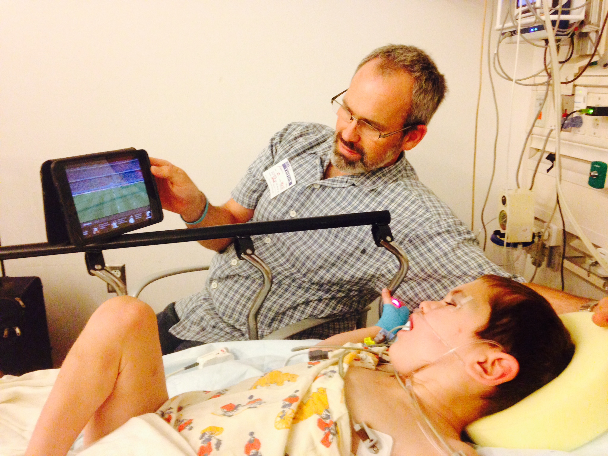 Rudy ended up having a four-hour heart cath. Longer than everyone expected because of what the team saw when they got in there. Dr. Dan and Dr. Harake saw a couple places where stents would ease the workload on the heart and were successful in doing so. More details later but for now we’re waiting it out in PACU until they give Rudy a room tonight. His first word when we got to him was “UP!” so we’ll see how successful we are at getting him to lie still like he’s supposed to. For now, the World Cup seems to be doing the trick!